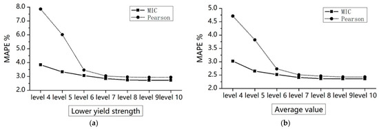 In order to verify that the MIC-based feature selection method can characterize the nonlinear correlation relationships between features more reasonably, we use the Pearson coefficient matrix to represent the initial correlation, and compare the prediction error under two correlation measures. The prediction error of “lower yield strength” (left) and the average error of three mechanical properties (right) are shown in Figure 11. It can be seen that the overall error of MIC-based feature selection method is lower than that of Pearson-based method. With the increase of clustering level, the prediction accuracy difference between the two methods gradually becomes smaller.