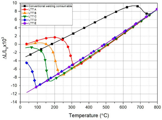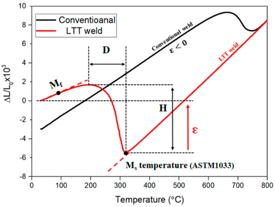 All the LTT welds showed relatively low Ms temperatures compared to welds using conventional welding consumables. The Ms temperature of the LTT welds decreased from 319 °C to below room temperature as Creq and Nieq increased, while maintaining the Creq/Nieq ratio at 1.7. The maximum value of net strain was observed for a LTT specimen C with an Ms temperature of 175 °C. On the other hand, the maximum net strain for specimen D and E occurred at temperatures below room temperature, while the maximum expansion point decreased without further expansion. For specimens D and E, the H and D values were not accurately measured because the volume expansion did not reach its maximum value at room temperature. If the expansion section due to the transformation of specimens A, B, and C was applied to specimen D, the point at which the expansion of the volume became maximum due to the martensitic transformation was expected to be about −32 °C. Despite the decrease in Ms temperature, the net strain (ε) showed a tendency to increase and then decrease. From the dilatometer analysis, expansion by phase transformation of the LTT materials used in this study maximized at an Ms temperature of approximately 175 °C. This means that a lower Ms temperature alone did not have a beneficial effect on deformation.