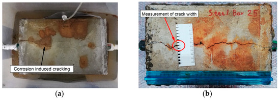 The occurrence of corrosion phenomena of actual reinforced concrete structures in the natural environment takes place slowly over a period of decades. In order to accelerate the consequences of natural corrosion, laboratory experimental tests on the reinforced concrete specimens were carried out by the anodic corrosion method (Figure 3a,b). With a view to simulate the corrosion process and to probe the effect of different intensities of corrosion phenomena on bond loss, the specimens were retained in the cells, filled with 5% sodium chloride (NaCl) solution by the weight of water (for different exposure times) and a constant current of 0.12 A was induced via a continuous power supply. The imposed current to the main reinforcing bar of 250 mm corresponds to a current density of about 1 mA/cm2. However, in the case of a group of specimens with stirrups, the increased volumetric ratio of steel resulted in decreased imposed current density to the longitudinal bar. Several studies have indicated the difference between the theoretical mass loss via Faraday law and the actual mass loss from the experiments [38]. Following that, the time necessary for obtaining the target corrosion levels (1%, 2%, 4%, 6% and 8% mass loss of the longitudinal bar) could not be accurately estimated through the theoretical Faraday law, since the steel bars were embedded in concrete and the different amount of transverse reinforcement (stirrups spacing) alters the corrosion rate. Thus, based on previous scientific works [30], which correlate the corrosion level of steel bars with the width of surface cracking on concrete, the end of each accelerated corrosion time was set until a desired crack width developed.
