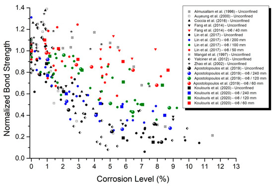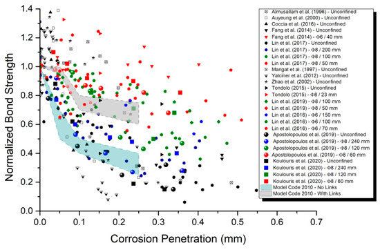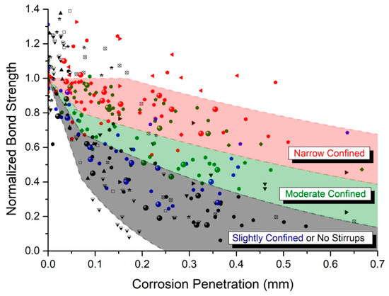 Nonetheless, while the theoretical framework is well-established, the reliable prediction of the corrosion process in the RC structural members has hardly been successful due to the inherent uncertainties. The current knowledge is based on experimental bond resistance data of corroded RC specimens, where the accelerated corrosion technique and the methods used to test bonding differ. This is depicted in the existing recommendations of Model Code 2010 [37], where indicative ranges of residual bond strength due to corrosion are proposed, as a function of corrosion penetration depth and surface cracks, taking solely into account the presence or absence of stirrups (links) as an on–off criterion. However, the magnitude of bond loss due to corrosion is highly affected by the passive confinement level through the amount of transverse reinforcement. Hence, there is need to amend the international design codes regarding the quantification of residual bond strength due to corrosion. In addition, the penetration depth as a corrosion damage index refers to a uniform reduction of the rebar cross section, whereas the damage is mainly depicted by nonuniform pitting corrosion. Due to these factors, research is needed to establish degradation factors, including the effect of both the density of stirrups and local reduction of cross-section in maintenance of bond strength of corroded RC elements. Based on broad and ongoing experimental research related to the bond loss of corroded RC specimens, combined with collected experimental data in literature, this manuscript investigates the degradation laws of bond strength due to corrosion and focuses on the factor of confinement through stirrups density. Furthermore, the recollected experimental results are compared to the recommendations of Model Code 2010 [37], to demonstrate the gap of the existing design codes and to enhance them.