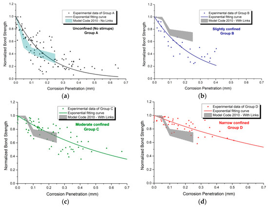 As presented before, Model Code 2010 refers to the residual bond strength due to corrosion in the presence or absence of stirrups. In the case of absence of transverse reinforcement (no links), in Figure 8a, the Model Code 2010 recommendations satisfactorily predict the normalized bond strength of the corresponding tested specimens of group A (no stirrups). On the other hand, in the case of presence of transverse reinforcement (with links), there is a gap in the predictive curves, owing to the different number of stirrups in RC specimens. More specifically, those proposed by Model Code 2010 boundaries tend to predict accurately the residual bond strength only of group C (moderate confinement), shown in Figure 8c, whereas it gives a conservative estimate for group D (dense stirrups) (Figure 8d). Groups C and D represent modern RC structures designed by demanding codes. Moreover, as depicted in Figure 8b, the predictive boundaries of Model Code 2010 overestimate the bond loss of slightly confined RC elements, group B, which are indicative of existing aging structures with wide stirrups spacing. Finally, according to the experimental data, the predictive boundaries for all cases need to be extended for greater levels of corrosion damage.
