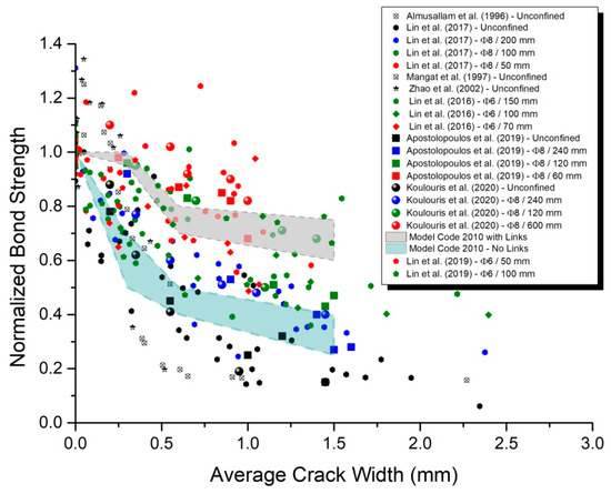 As previously indicated by the authors, the surface crack width on concrete seems to be an appropriate nondestructive assessment tool of corrosion, linking the measured crack width with the corrosion damage of reinforced concrete. This agrees with the results of other research by Boccio, Fischer, Lundgren, Andrade et al. [28,29,30,31,32,36]. In this framework, the outcome of bond loss, derived from this experimental study and combined with other comparable data in literature, which are presented relative to the average crack width due to corrosion on the concrete’s surface, shown in Figure 11, allowing for investigation of their correlation. In order to comment on the level of knowledge in the existing code recommendations, the proposed predictive zones of Model Code 2010 on bond loss due to corrosion are compared to the experimental database.