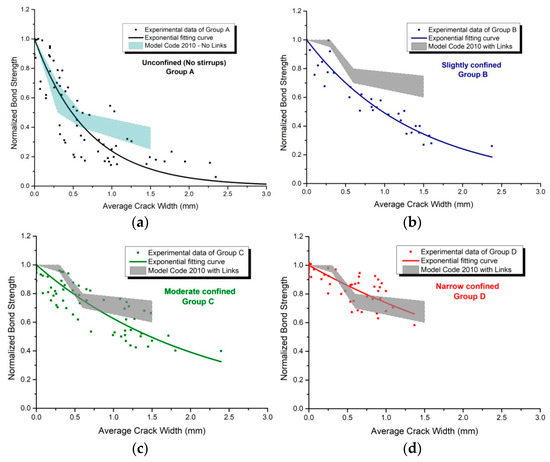 Extracted exponential fitting curves of bond loss as a function of average crack width, for each confinement level group. (a) Unconfined specimens, (b) Slightly confined specimens, (c) Moderate confined specimens, (d) Narrow confined specimens.