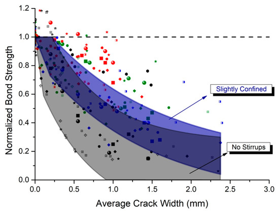 It is common knowledge that the development of surface cracking, which is inextricably linked to the corrosion of steel reinforcement, leads to degradation of bond strength between steel and concrete. As depicted in Figure 11, the presence of confinement contributes to bond behavior, delaying the reduction of the initial bond strength, while the amount of transverse reinforcement provides different levels of passive confinement in RC elements, which tend to follow a distinctive distribution.