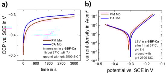 Figure 1a shows the OCP progression of a freshly prepared, pure Mo sample immersed in c-SBF-Ca for 1 h. The results of the electrochemical measurements are summarized in Table 4. The curve shape is similar for PM Mo and CA Mo, starting with rapidly increasing values in the first minutes. The OCP stabilizes at values of approx. −320 mV and −340 mV for CA Mo and PM Mo, respectively, after about 900 s. Afterwards, the OCP steadily and slowly approaches -302 mV for CA Mo and −310 mV for PM Mo after 3600 s. Figure 1b shows representative curves of LSV measurements. The final OCP values correspond well with the corrosion potentials of CA Mo and PM Mo. Electrochemical corrosion rates of 5.7 ± 1.2 µm/y and 7.1 ± 0.1 µm/y were derived by Tafel analysis. The cathodic branches of the LSV curves are practically identical whereas the anodic branches have similar slopes, but are shifted in potential by −10 mV for PM Mo compared to CA Mo.