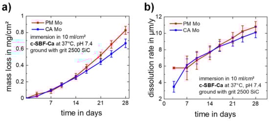 Molybdenum ion concentration-derived mass losses and dissolution rates are depicted in Figure 3. According to the ICP-OES data, mass losses are very similar for PM Mo and CA Mo in the first 14 days of immersion. Thereafter, PM Mo dissolves slightly faster up to a total mass loss of 0.83 ± 0.05 mg/cm2 after 28 days of immersion in c-SBF-Ca compared to CA Mo with 0.67 ± 0.05 mg/cm2. The progression of the mass loss is not linear but rather exponential. This results in linearly increasing dissolution rates without flattening of the curves over the course of 28 days immersion. The overall dissolution rates for PM Mo and CA Mo are similar on day 28 with 10.8 ± 0.6 µm/y and 10.1 ± 0.7 µm/y, respectively.