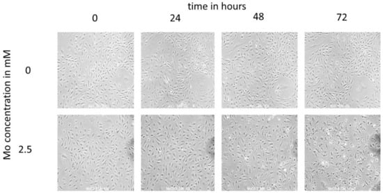 HCAECs cultured with different Mo ion concentrations at 37 °C for 0, 24, 48, and 72 h are depicted in Figure 4. While no difference was found between cells incubated with 0.16 mM, 0.63 mM, or 1.25 mM of Mo (15, 60, and 120 mg/L dissolved Mo, respectively) and untreated cells at all time points, the maximum Mo concentration of 2.5 mM (240 mg/L dissolved Mo) resulted in signs of beginning of cell death at 48 h (increased granularity) and signs of progressed cell death (shrinking, detaching) at 72 h. Since the only Mo concentration causing cell death is more than 3000-fold the calculated daily mass loss of PM Mo immersed in c-SBF-Ca (61 µg/d (0.64 µmol)), HCAECs seem to tolerate Mo well.