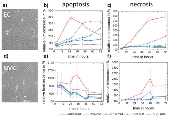 Apoptosis and necrosis of HCAECs and HCASMCs were measured after different periods of incubation in cell medium with three different Mo ion concentrations. In the HCAEC culture (Figure 5a), the specimen incubated with the highest Mo concentration (1.25 mM) showed increased apoptosis compared to the untreated control, starting at the first time point of the measurement and becoming highly significant after 44 h (Figure 5a). Cells incubated with the second highest Mo concentration (0.63 mM) showed increased apoptosis after 44 h while the specimen incubated with the lowest Mo concentration (0.16 mM) did not differ from the untreated control. Increased necrosis was detected only for the specimen incubated with the highest Mo concentration after 44 h (Figure 5c).