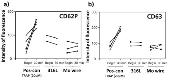 Platelets were isolated from human citrated blood of a healthy, non-anticoagulated donor and placed in PBS. The cells were divided into three specimens, which all were incubated at 37 °C for 30 min: (1) positive control (Pos-con): TRAP-6 (Thrombine receptor activator peptide 6, 20 µM in PBS (3497-Tocris Bioscience, Wiesbaden-Nordenstadt, Germany); (2) 316L stainless steel wire, and (3) Mo wire. After 30 min, each specimen was divided into two parts, which were incubated with fluorescently labeled antibodies for either CD62P (550888, BD Biosciences, Heidelberg, Germany) or CD63 (556020, BD Biosciences, Heidelberg, Germany), both platelet activation markers. After fixation of the cells with formalin, the measurement was performed using flow cytometry (fluorescence-activated cell sorting, FACS).