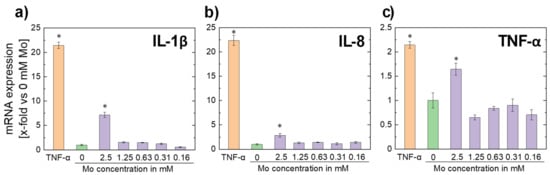 Expression of inflammation markers by human monocytes 24 h after incubation with different Mo ion concentrations. Significantly enhanced expression levels of IL-1β (a), IL-8 (b), and TNF-α (c) were only measured in cells treated with the highest Mo ion concentration (2.5 mM), while all cells incubated with lower Mo ion concentrations did not differ from the untreated control. Incubation with TNF-α (10 ng/mL) served as the positive control (n = 2, * p < 0.05 vs. 0 mM Mo).