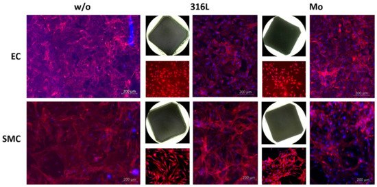 Colonialization of metal slices (Mo and 316L) by HCAECs or HCASMCs compared to culture dishes without metallic samples (w/o). In case of either metal, fluorescence microscopy reveals attached cells after 6 h of incubation.
