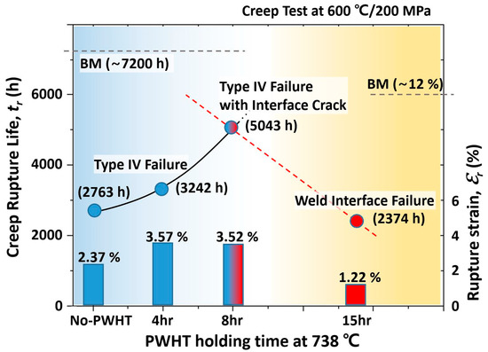 Comparison of the creep properties at 600 °C/200 MPa as a function of PWHT holding time at 738 °C.