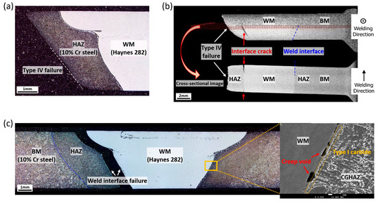 Several authors have reported the possible causes of interface failure of DMWs: (1) a large difference in the coefficient of thermal expansion (CTE) between the ferritic and austenitic alloys [12,13], (2) creep voids nucleation and growth around Type I carbides [13,14,15], (3) oxide notch formation at the interface [8,13,16,17], and (4) a sharp change in microstructure and mechanical properties across the fusion line [13,18,19]. However, the mechanism of a weld-interface premature failure has not been fully investigated, specifically in DMWs.