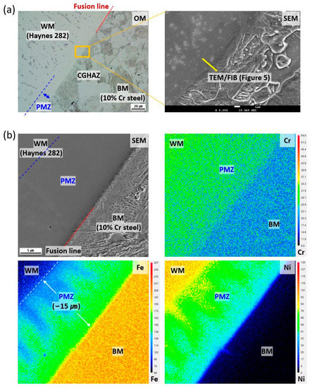 The microstructure and EPMA analysis results across the weld-interface region under the as-welded condition are shown in Figure 4. In the coarse-grained HAZ (CGHAZ) near the fusion boundary, most of the precipitates dissolved in the matrix because of high peak temperature for welding, and the structure transformed first to austenite and then to martensite [22,23]. Within the fusion zone near the fusion line, a partially mixed zone (PMZ, ~15 μm in width) formed. In this zone, the composition changed gradually from that of the fusion zone to that of the BM [13,24,25]. In the PMZ (Figure 4b), Ni and Cr contents increased, and Fe content decreased from the 10% Cr steel BM toward the Haynes 282 weld metal (WM). The weld interface between WM and CGHAZ is indistinct because an increase in Cr and Ni contents at the weld interface makes this region resistant to etching by Villela’s reagent (Figure 4a).