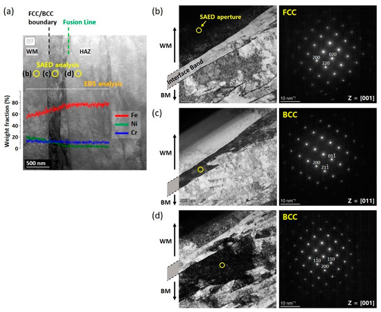 To investigate the detailed-microstructural characteristics of the weld-interface region, an FIB specimen for the TEM analysis was extracted from the fusion boundary marked by a yellow line in Figure 4a. Figure 5a shows a bright-field TEM image with an EDS line analysis. The interface band (~0.5 μm in width) was observed in the PMZ adjacent to the fusion boundary; however, there were no abrupt chemical composition changes across the interface band. The SAED of the WM corresponded to the FCC structure because of the Haynes 282 filler metal (Figure 5b). However, the interface band was confirmed as the BCC structure by a SAED analysis (Figure 5c). The chemical composition in the interface-band region is similar to the HAZ because insignificant mixing occurred with the filler metal, but it had a slightly high Ni content. The Ni element, a strong stabilizer of FCC, tends to decrease martensite start (Ms) temperature [13,19]. During welding, the 10% Cr steel HAZ adjacent to the WM was austenitized (FCC in structure) where temperature exceeded the austenite transformation temperature (A3). Upon cooling, a martensitic transformation (BCC in structure) occurred in the HAZ (Figure 5d). As the cooling progressed, it was expected that the interface-band region subsequently transforms into martensite. Martensite transformation did no longer form in the fusion zone where Ms temperature dropped below room temperature. The interface band consisted of FCC/BCC boundary and fusion boundary, respectively, for the WM and BM sides.