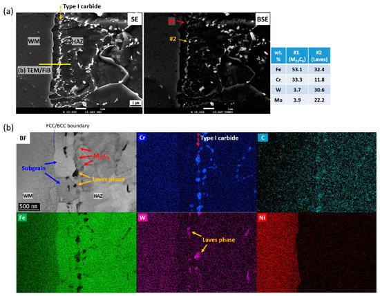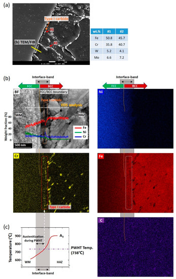 The SEM microstructure and EDS analysis results of the weld-interface region after PWHT at 738 °C for 15 h are shown in Figure 6a. The PWHT changed the martensite to the tempered martensite, consisting of the precipitates in the HAZ. Large Cr-rich M23C6 carbides were distributed along the grain, packet, and block boundaries. Furthermore, small Cr-rich M23C6 carbides were observed near the weld interface in a row, which is known as Type I carbides [13,26]. Importantly, precipitates were not observed between the FCC/BCC boundary and the row of Type I carbides. Figure 6b shows TEM/EDS analysis results of the FIB specimen extracted from the fusion boundary marked by a yellow line in Figure 6a. The bright-field (BF) TEM image and EDS elemental mapping results correspond well with the Cr-rich carbides distribution. The chemical composition in the interface-band region along the white dotted line (Figure 6b) showed an abrupt increase in Cr near the weld interface. Type I and small Cr-rich carbides were produced ~0.3 μm away from the FCC/BCC boundary within the interface band.