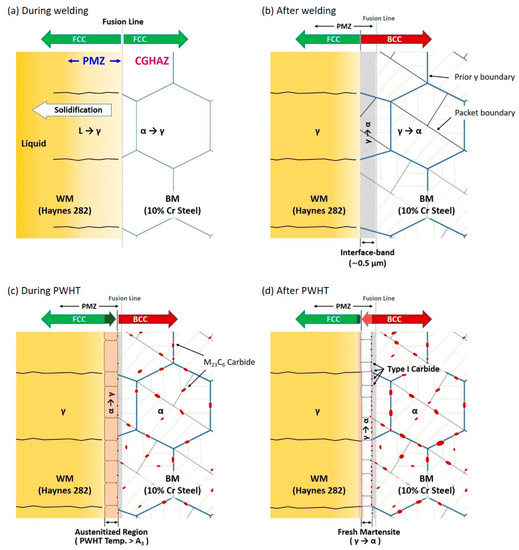 A schematic illustration of possible microstructure evolution and Type I carbide precipitation at the weld interface during welding and PWHT: (a) during welding, (b) after welding, (c) during PWHT, and (d) after PWHT.