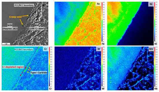 Figure 10 shows the segregation of Cr, W, and Mo elements to the grain/packet/block boundaries measured by EPMA. The higher concentration of Cr along the weld interface is associated with the Type I carbide, and the Cr-depleted region formed in the interface-band region was observed near the row of Type I carbides. At the weld interface, additional precipitation of the Cr-rich M23C6 carbides expense Cr solutes from the matrix adjacent to the carbides during creep exposure occurred, which resulted in the formation of the Cr-depleted region near the Type I carbides. Remarkably, the creep voids were observed along the Cr-depleted region of the weld-interface region. Furthermore, the high W and Mo concentrations contributed to the formation of Laves phase precipitates near the Type I carbides (Figure 9b).