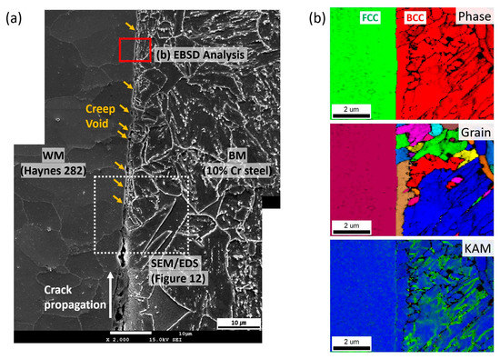 Creep-void formation in the weld-interface region near the crack tip after the creep interruption test: (a) SEM image and (b) EBSD analysis (phase map, unique grain color map, and KAM).