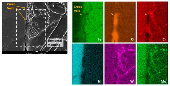 For all the creep specimens with weld interface cracking, interface cracking always initiated from the surface and propagated inward through the subgrains between the FCC/BCC boundary and the row of Type I carbides (Figure 3b and Figure 11a). Figure 12 shows the SEM/EDS elemental distribution of the crack-propagation region at the weld interface. Oxidation along the interface crack was observed. The oxide notch is known to be produced at the interface and it leads to interfacial failure by the growth of the oxide [8,16,17]. Because of the relatively poor oxidation resistance of the Cr-depleted region and the difference in creep strength between austenitic WM and ferritic BM, uncoordinated deformation should induce an oxide-notch initiation [8,34]. In the presence of geometric discontinuities such as notches, localized creep takes place in a small region near the notch root [35,36]. Once a crack was initiated ahead of the oxide notch, crack propagation occurred along the soft recrystallized grains of the weld-interface region under the external creep stress (Figure 11a), providing fresh surface to be exposed to the air to promote the oxidation. Moreover, crack propagation through this interface region became dominant by the creep voids formed ahead of the crack.
