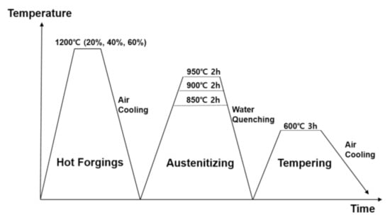 | Specimen | Hot Forging Ratio (%) | Austenitizing Temperature (°C) | Austenitizing Time (h) | Tempering Temperature (°C) | Tempering Time (h) |