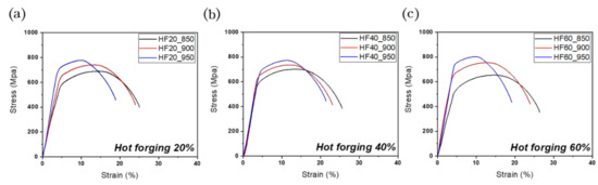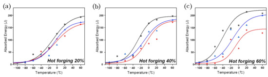 - In all hot forging conditions, the impact characteristics at an austenitizing temperature of 850 °C showed the best performance with the lowest DBTT temperature because all grain boundaries formed HAGBs at 850 °C with the lowest dislocation density and high fraction of PF with excellent toughness. As the austenitizing temperature increased from 850 °C to 950 °C, the absorbed energy decreased and the DBTT temperature increased. The fraction of PF structure decreased as the austenitizing temperature increased, and the fraction of the BF and M with high dislocation density, lath structure and low toughness increased.