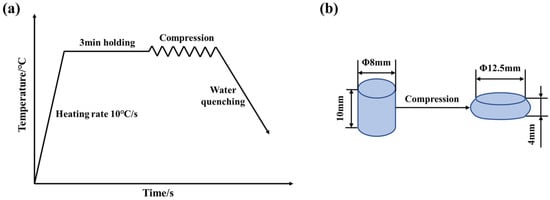 (a) Schematic diagram of the hot compression tests, (b) Schematic diagram of the specimens before and after compression.