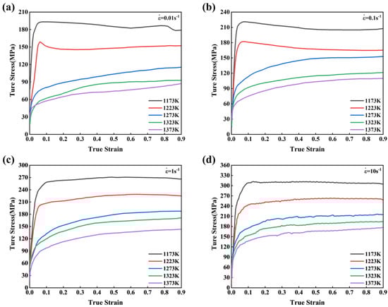 True stress–strain curves under the different deformation temperatures with strain rates. (a) 0.01 s−1; (b) 0.1 s−1; (c) 1 s−1; (d) 10 s−1.