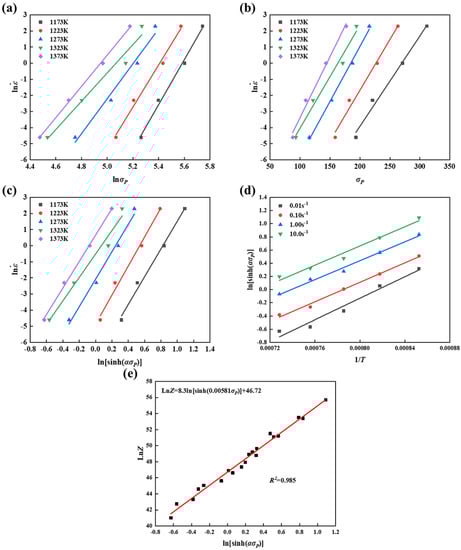 Table 2 lists the peak flow stress (σP) values in the temperature range of 1173–1373 K and the strain rate of 0.01–10 s−1. Since the strain for determination of flow stress is not specified, the description of the flow stress in Equation (1) is incomplete. Therefore, the steady-state stress, the peak stress, and the stress corresponding to a particular strain can be used for this purpose. However, the peak stress is usually used because the steady-state stress cannot be accurately obtained, or there has been some softening during the morphological evolution; similar findings were reported by Cai et al. [] and Chen et al. [].