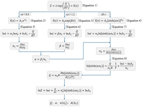 In the hot working process of metal materials, once the chemical composition is determined, the flow stress is mainly determined by the strain rate and the deformation temperature. The Zener-Hollomon parameter (Z) [] is usually used to quantify the relationship between flow stress, deformation temperature, and strain rate.