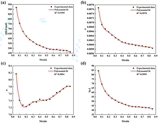 The calculation flow chart of the material-dependent constants and activation energy is shown in Figure 4. The material-dependent constants and activation energies are calculated in the strain range of 0.05–0.85 (the interval is 0.05). Figure 5 shows the curves of the material-dependent constants concerning strain (fitted by polynomial Equation (10)). In Figure 5, the correlation coefficients (R2) are all greater than 0.985, and the highest is 0.9995, which indicates that the accuracy of the fitted curves is very high. The S in Equation (10) stands for any material-dependent constant (Q, α, n, and A) in Figure 4. The coefficients of the best fitting polynomial for any material constant are listed in Table 3.