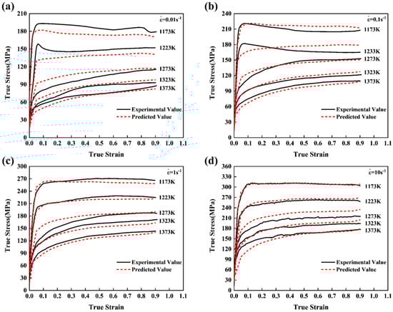 Comparison of predicted and experimental true stress-strain curves. (a) 0.01 s−1; (b) 0.1 s−1; (c) 1 s−1; (d) 10 s−1.