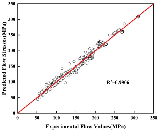 Figure 7 describes the correlation between the predicted values and the experimental values in the temperature range of 1173–1373 K with strain rates of 0.01–10 s−1. The R is 0.9906, very close to 1. The results show that the flow stress of 30Cr4MoNiV UHS steel can be accurately predicted by Equation (11) in the temperature range of 1173–1373 K and a strain rate of 0.01–10 s−1.