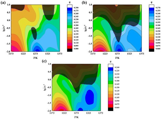 Processing maps at different true strains: (a) ε = 0.3; (b) ε = 0.6; (c) ε = 0.9. The shaded areas are the plastic instability areas, and the colored areas represent the different η values.