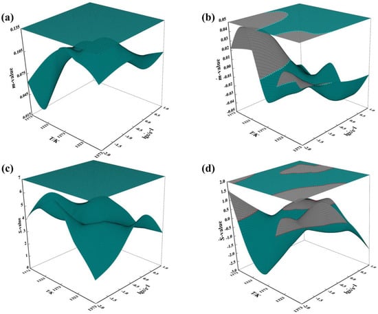 The response 3D surfaces of four criteria on deformation temperature and strain rate at the true strain of 0.9: (a) m; (b) ; (c) S; (d) . The colored parts are the stable areas, and the shaded (gray) parts are the unstable areas.