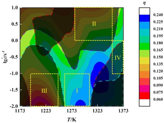Area IV: Instability area, which meets the other three plastic instability criteria except and . Deformation temperature 1353–1373 K and strain rate 0.1–1 s−1, the range of η in this area is 0.180–0.225.