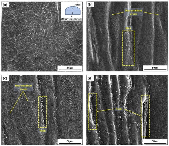 As shown in Figure 11c, it is obvious that dynamic recovery and incomplete dynamic recrystallization has occurred at 1223 K and 0.01 s−1, the new fine grains are also formed, but coarse casting grains still exist compared with Figure 11a,b. Simultaneously, the voids were found under this condition, which have a negative effect on the mechanical properties of the materials. Therefore, hot working of 30Cr4MoNiV UHS steel should be avoided in this deformation condition.