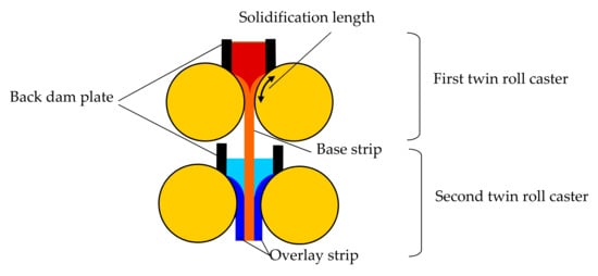 A schematic illustration of a vertical-type tandem twin roll caster (VTTRC) is shown in Figure 1 [,,,,,,,,,,]. Casting is conducted in an oxidizing atmosphere. The strip cast by the first twin roll caster is called a base strip, and the strip cast by the second twin roll caster is called an overlay strip. The molten metal of the overlay strip is poured after the base strip has gone through the roll gap of the lower twin roll caster. The roll speed of the upper twin roll caster and that of the lower twin roll caster are almost the same. The contact length between the aluminum alloy and the roll is called the solidification length, which is set by the position of the back dam plate. The thickness can be set by the solidification length [,,]. This means that the thickness ratio between the base strip and the overlay strip can be controlled by the solidification length. Copper rolls were used to increase the cooling speed and casting speed. The roll speed of the VTTRC was much higher than that of the conventional twin roll caster for aluminum alloy (CTRCA), and the roll load was much smaller than that of the CTRCA. A parting material is not sprayed on the roll because the strip does not stick to the roll. The parting material creates heat resistance between the roll and the molten metal. Therefore, when a parting material is not used, rapid solidification occurs, and it is possible to increase the roll speed.