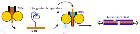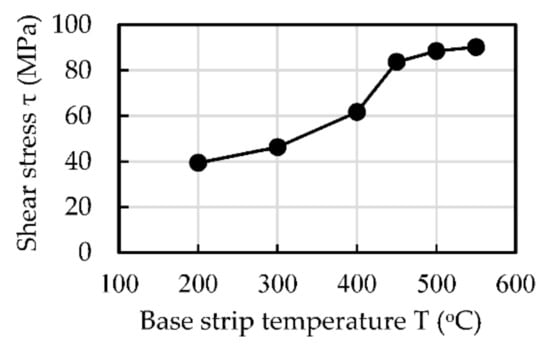 Factors affecting the bonding were investigated [,,]. The effect of the temperature of the base strip on bonding between the base strip and the overlay strip was investigated []. The experimental procedure is shown in Figure 2. The roll diameter of the twin roll casters was 300 mm, the roll load was 88 N/mm, the solidification length was 100 mm, and the roll speed was 30 m/min. The base strip was 3004 alloy and the overlay strip was 4045 alloy. This combination is the same as in the brazing sheet used for an automotive heat exchanger. The pouring temperatures for the 3004 and 4045 alloys were 680 °C and 620 °C, respectively. The roll-cast 3004 strip was cooled down to a designated temperature, and then inserted into the roll caster to cast the clad strip. The temperature of the 3004 base strip was set at 200, 300, 400, 450, 500, and 550 °C. The relationship between the time the strip was released from the first caster and the temperature of the base strip is shown in Figure 3. A tensile shear test was conducted on the as-cast clad strip, with the results shown in Figure 4. The shear stress increased as the temperature of the 3004 base strip increased to 550 °C, and reached a peak when the temperature of the 3004 base strip was higher than 450 °C.