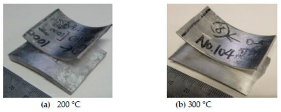 Cold rolling was conducted on the as-cast strip, and a bending-fracture test was conducted on the cold-rolled strip to investigate the bonding characteristics. When the temperature of the base strip was 200 °C or 300 °C, the overlay strip peeled from the base strip. Overlay strips peeled by cold rolling are shown in Figure 5. The clad strip could be cold rolled down to a thickness of 1 mm at base strip temperatures ranging from 400 °C to 550 °C.