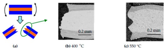 A schematic illustration of the bending-fracture test and cross-sectional images of the fracture areas are shown in Figure 6. The bending-fracture test was conducted on cold-rolled 1 mm-thick clad strip. The overlay strip did not peel from the base strip in the bending-fracture test. It appeared that the overlay strip was strongly bonded to the base strip when the temperature of the base strip was higher than 400 °C.