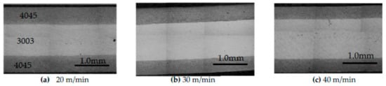 The effect of the roll speed on bonding was investigated []. The base strip was 3003 alloy and the overlay strip was 4045 alloy. The roll load was 22 N/mm, the roll diameter was 200 mm, and roll speeds of 20, 30, and 40 m/min were investigated. The pouring temperatures for the base strip and the overlay strip were 670 °C and 700 °C, respectively. The solidification length was 80 mm, and the as-cast clad strip was cold. The overlay strip did not peel from the base strip. A cross-section of the cold-rolled strip is shown in Figure 7. The base strip and the overlay strip were strongly bonded. The roll speed had no influence on the condition of the interface between the base strip and the overlay strip. This result was considered to be due to the effect of the base strip temperature on the bonding shown above. When the roll speed becomes higher, it is thought that the contact time between the base strip and the overlay strip at the roll bite becomes shorter. The roll speed did not affect bonding within the investigated roll speeds until peeling of the overlay strip occurred.