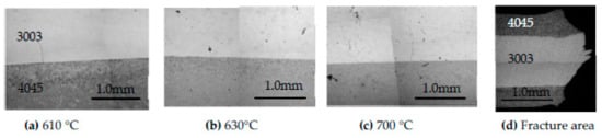 The effect of the molten metal temperature of the overlay strip on bonding was investigated [,]. The base strip was 3003 alloy and the overlay strip was 4045 alloy. The conditions were a solidification length of 80 mm, a roll diameter of 200 mm, a roll load of 22 N/mm, and a roll speed of 40 m/min. The pouring temperature for the base strip was 670 °C. Pouring temperatures of 610 °C, 630 °C, and 700 °C were investigated for the overlay strip, and the extents of superheating were 15 °C, 30 °C, and 105 °C, respectively. The solidus line for the 3003 alloy was at 643 °C. When the pouring temperature for the overlay strip was 610 °C or 630 °C, they were lower than the solidus line for the 3003 base strip, and the overlay strip bonded to the base strip. The 4045 alloy bonded to the 3003 alloy under all superheating conditions. The interface between the base strip and the overlay strip for an as-cast clad strip is shown in Figure 8. The pouring temperature for the molten metal for the overlay strip did not influence the interface between the base strip and the overlay strip. The clad strip in which the molten metal of the overlay strip was cast at 610 °C was cold-rolled, and a bending-fracture test was conducted. A cross-section of the fracture area is also shown in Figure 8. No peeling occurred between the base strip and the overlay strip. This shows that whether the pouring temperature for the overlay strip was higher or lower than the solidus line for the base strip was not a dominant factor in bonding. The superheating of the molten metal of the overlay strip had no influence on bonding.