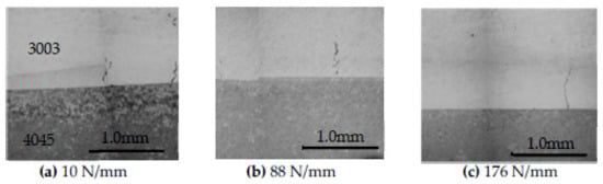 The effect of the latent heat of the overlay strip on the bonding was investigated. In Figure 12, the base strip is 3003 alloy, and one overlay strip is 4045 alloy and the other is Al-4%Si or Al-2%Mg alloy []. The roll diameter was 300 mm, the roll load was 88 N/mm, the solidification length was 100 mm, and the roll speed was 30 m/min. The solidus lines, liquidus lines, and pouring temperatures for these aluminum alloys are shown in Table 1. The 4045 overlay strip was bonded to the 3003 base strip without a gap at the interface. When Al-4%Si or Al-2%Mg was used as the overlay strip, it did not bond to the 3003 base strip. The pouring temperature for the 4045 alloy was lower than that of Al-4%Si and Al-2%Mg. The pouring temperatures for Al-4%Si and Al-2%Mg were higher than the liquidus line of the 3003 alloy, while the pouring temperature for the 4045 alloy was 630 °C, which was lower than the solidus line for the 3003 alloy. The solidus and liquidus lines for the 4045 alloy were lower than those for Al-4%Si and Al-2%Mg. This shows that the solidus line, liquidus line, and pouring temperature for the overlay strip were not dominant factors in bonding. When the pouring temperature for the 4045 overlay strip was lower than solidus line for the 3003 base strip, the 4045 overlay bonded to the 3003 base strip as shown above.