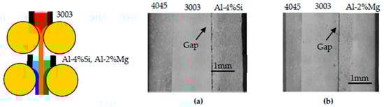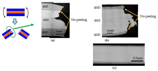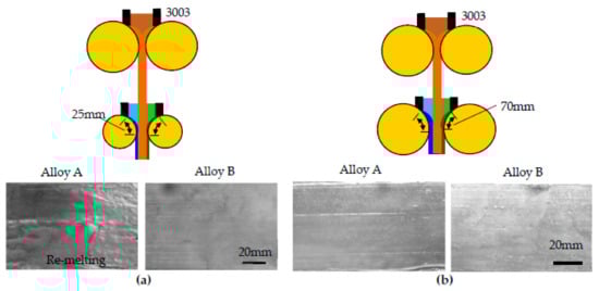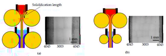 The influence of the thickness of the overlay strip on the bonding between the base strip and the overlay strip was investigated. The experimental procedure is shown in Figure 10. The casting speed was 30 m/min and the roll load was 55 N/mm. As shown in Figure 10a, the roll diameter of the first and the second twin roll casters was 200 mm. The solidification length of the base strip was 60 mm, and that of the overlay strip was 80 mm. As shown in Figure 10b, the roll diameters of the first and second twin roll casters were 300 mm and 100 mm, respectively. The solidification length of the base strip was 120 mm, and that of the overlay strip was 25 mm. The pouring temperatures for the 3003 and 4045 alloys were 670 °C and 625 °C, respectively. The overlay strip in Figure 10a was thicker than that in Figure 10b, as the solidification length in Figure 10a was greater. In Figure 10b, a smaller diameter roll was used to make the overlay strip thinner. It is easy to make the solidification length shorter when the roll diameter is smaller [].