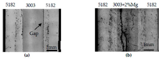 Cross-section of as-cast clad strips. (a) 5182/3003/5182 clad strip, (b) 5182/3003 + 2% Mg/5182 clad strip.