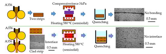 Heating of two stacked A356 strips with compression and three-layer A356 clad strips under semisolid conditions, and images of interfaces between strips.