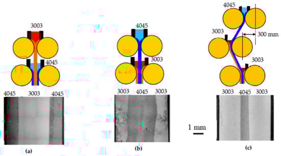 When the solidification temperature of the base strip was higher than that of the overlay strip, the base strip was not melted, and a clear interface between the base and overlay strips could be observed, as shown in Figure 15a. In Figure 15b, the positions of the aluminum alloys in the base strip and the overlay strip are reversed. When the solidification temperature of the base strip was lower than that of the overlay strip, the base strip was melted by heating from both sides of the overlay strip, and the Si from the 4045 alloy entered into the 3003 overlay by diffusion, as shown in Figure 15b. When the 3003 overlay strips were bonded one by one as shown in Figure 15c, the base strip was not melted. When the 3003 overlay strip was bonded to one side of the 4045 base strip, the other side contacted the roll, so the 4045 base strip was not heated from both sides. The base strip did not melt, and a sound clad strip could be cast [,,].