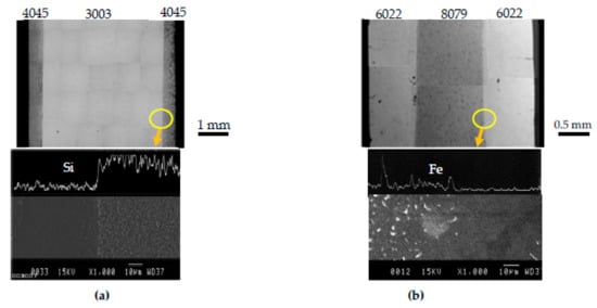 Line analyses at the interface between the base strip and the overlay strip for two kinds of three-layer clad strips are shown in Figure 17. As shown in Figure 17a, the base strip was 3003 alloy and the overlay strip was 4045 alloy. Si, an element of the 4045 alloy overlay strip, did not diffuse into the base strip [,,,]. As shown in Figure 17b, the base strip was 8079 alloy and the overlay strip was 6022 alloy, and the Fe in the 8079 alloy base strip did not diffuse into the overlay strip [,]. There was no diffusion of elements between the base and overlay strips. A clear interface was formed, as shown in Figure 17a,b. These results mean that if the base strip was melted by the molten metal of the overlay strip, the melted area was very thin, and a clear interface was formed.