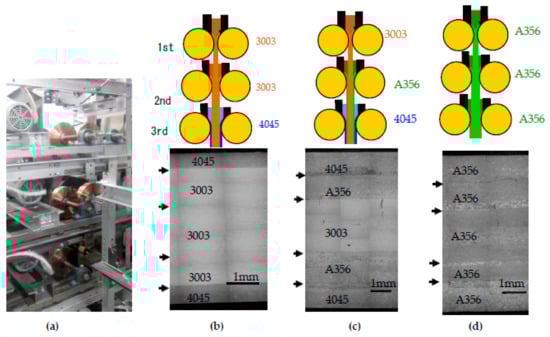 Photograph and schematic illustrations of vertical-type tandem twin roll casters to cast five-layer clad strips, and cross-sections of the five-layer clad strips. Arrows show the interfaces between the strips. (a) Photograph of rolls of a triple tandem-type twin roll caster. (b) The same alloy was used in the 1st and 2nd twin roll casters. (c) Different alloys used in each twin roll caster. (d) The same alloy was used in the 1st, 2nd, and 3rd twin roll casters.